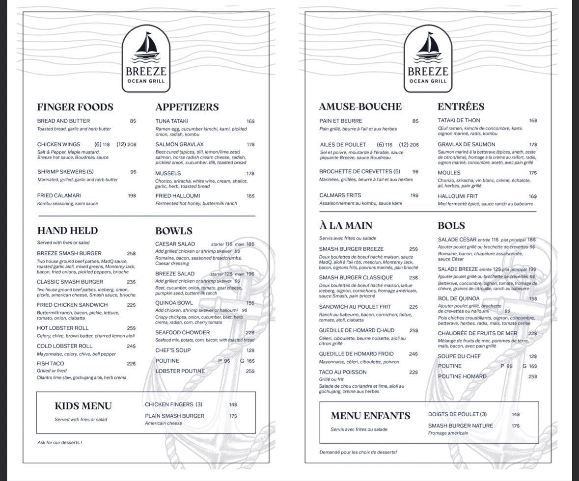 Nos voisins du Breeze Ocean Grill proposent un menu Taproom servi directement dans notre salle de dégustation. Fruits de mer frais, plats créatifs et ambiance détendue — une combinaison parfaite avec nos bières artisanales.